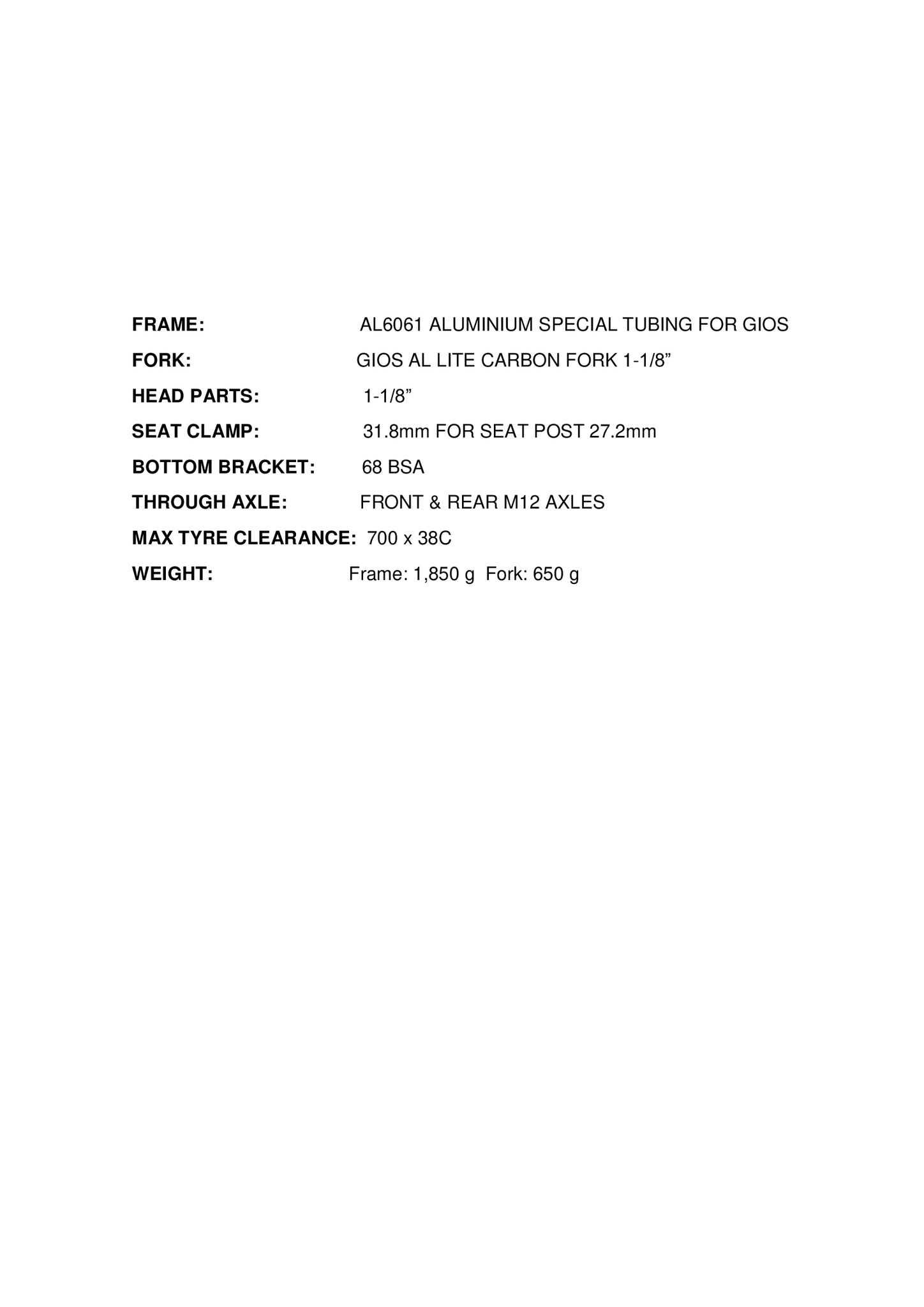 FRAME AL6061 ALUMINIUN SPECIAL TUBING FOR GIOS FORK GIOS AL LITE CARBON FORK 1-1/8" HEAD PARTS 1-1/8" SEAT CLAMP Φ31.8 FOR SEAT POST 27.2 BOTTOM BRACKET 68 BSA THROUGH AXLE FRONT & REAR M12 AXLES BREAK TYPE DISC MAXIMUM TIRE CLEARANCE 700 x 38C WEIGHT 1850g (FRAME) 650g (FORK) -